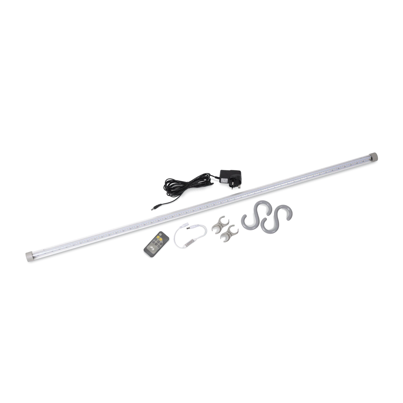 1 light; 1 remote; 1 remote receiver; 1 5m AC lead; 2 S-hooks; 2 pole clips