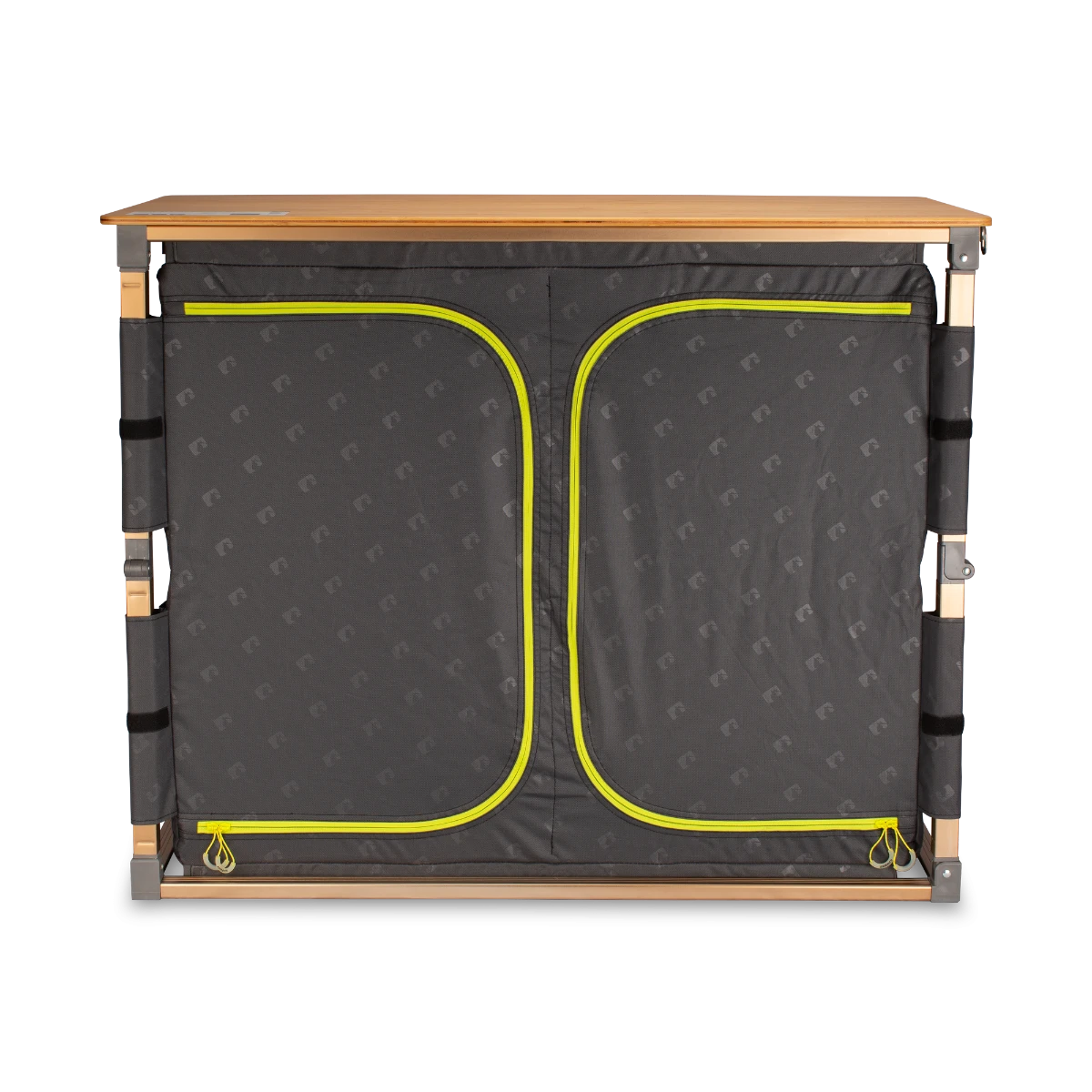 The Eco Fold Twin V2 features a naturally weatherproof and heat-resistant bamboo tabletop and rustproof aluminium frame. A perfect working surface to cook and prepare camp meals. The twin lower cupboards, along with side storage pockets, help to help keep your campsite organized. A retractable utility rack keeps utensils close at hand and can also store a basin for wash-up.